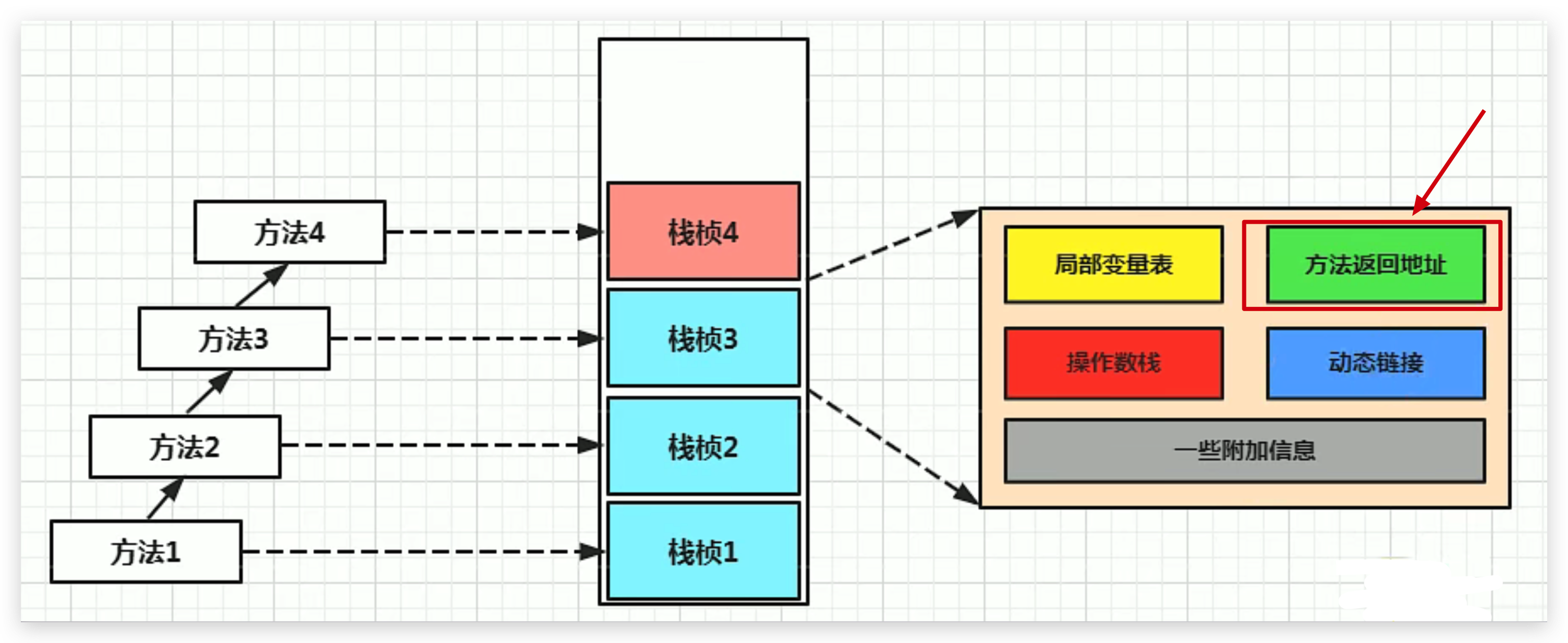 - 存放调用方法(栈帧)的 pc寄存器的值