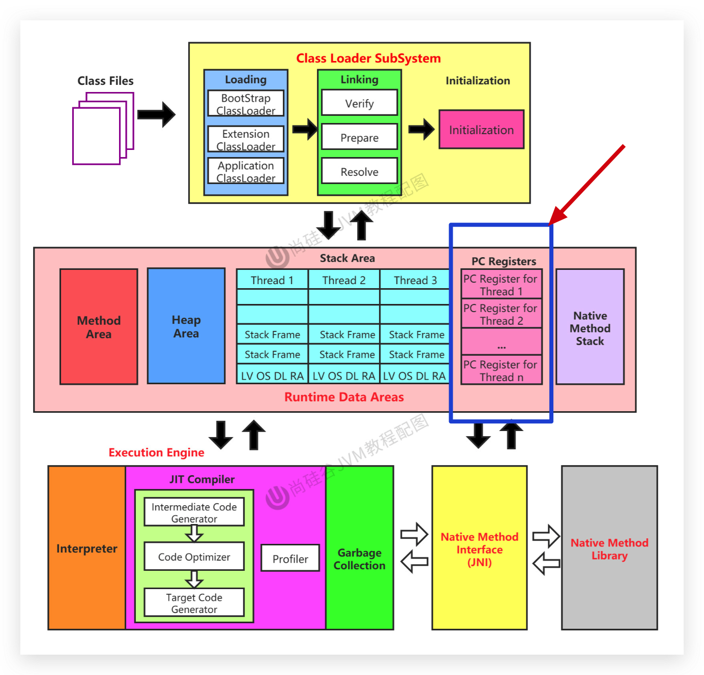JVM中的程序计数寄存器(Program Counter Register)中,Register 的命名源于CPU的寄存器,寄存器存储指令相关的现场信息。CPU只有把数据装载到寄存器才能够运行。