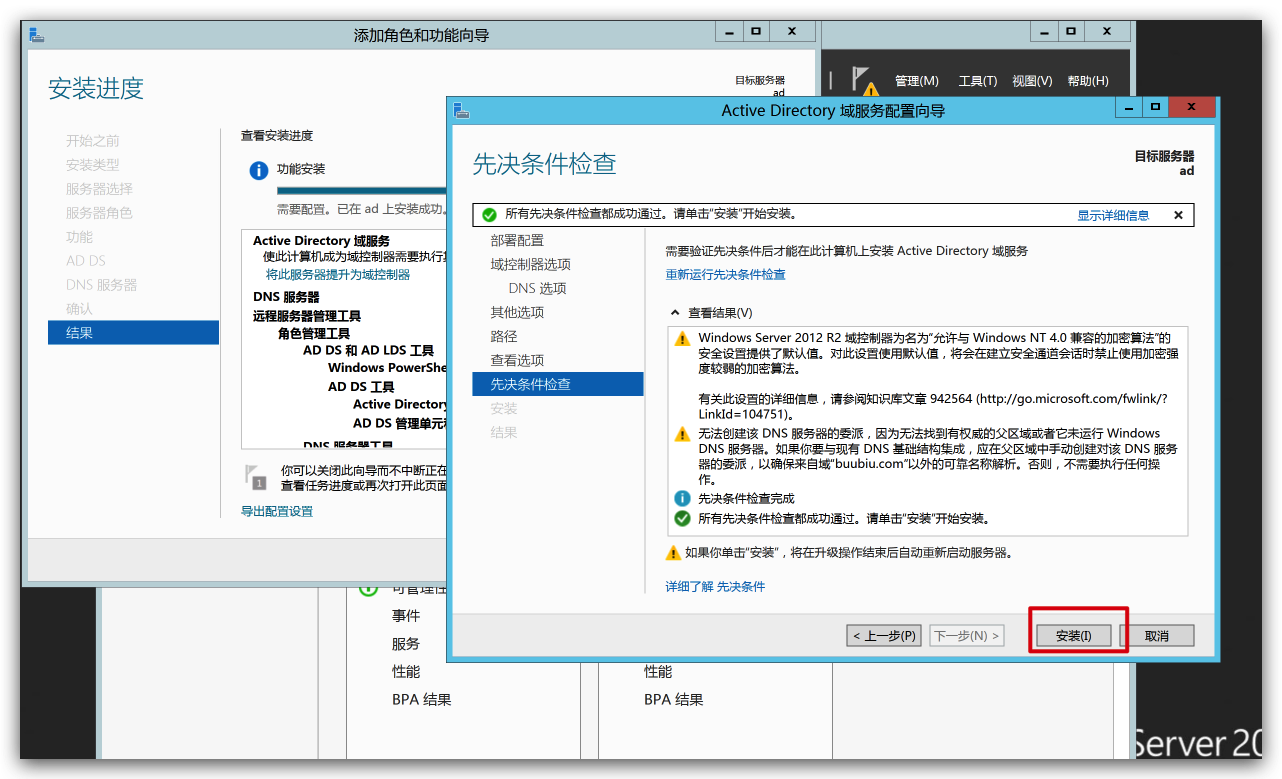 继续一直下一步,直到 “先决条件检查”,点击安装